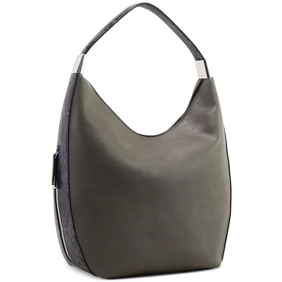 - Silver-tone exterior hardware; footed bottom; 1 side zipper pocket