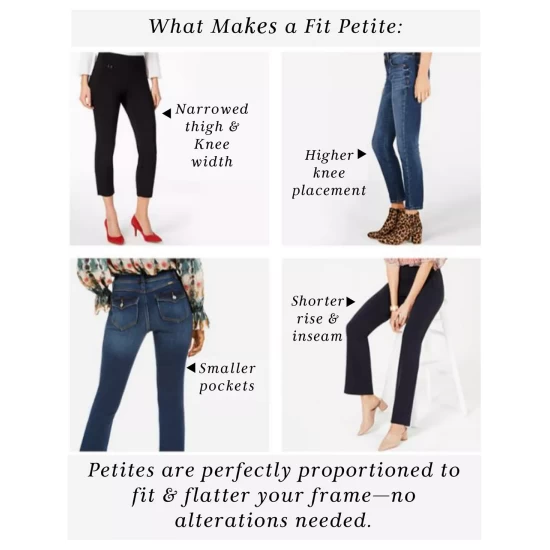 - Petite sizes designed to fit and flatter 5’4″ and under frame
