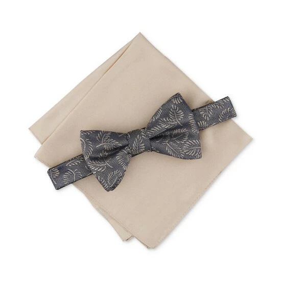 The unique leaf print on this Alfani bow tie is perfectly complemented by the rich tones of its accompanying pocket square.