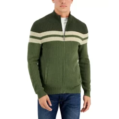 Refine your cool-weather look with the ribbed-knit design and colorblocked stripe styling of this full-zip cardigan from Alfani.
