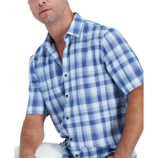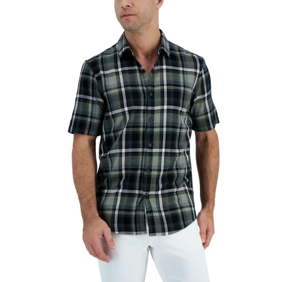 Alfani highlights signature style with this Panama plaid short-sleeve shirt, featuring a button-down silhouette and textured fabrication.