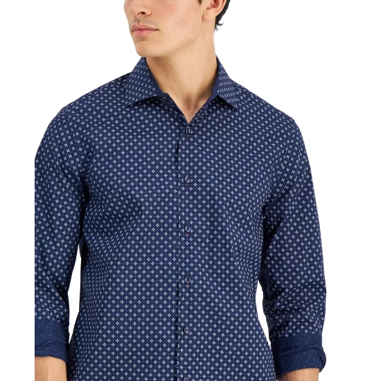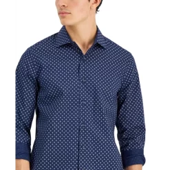 Outfitted with stain-resistant stretch fabric and an angled geometric print, Alfani’s slim-fit dress shirt brings versatility and comfort-forward style to your growing formal collection.