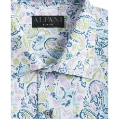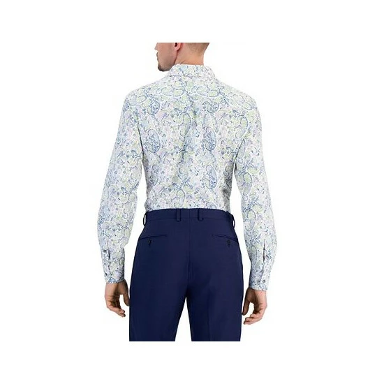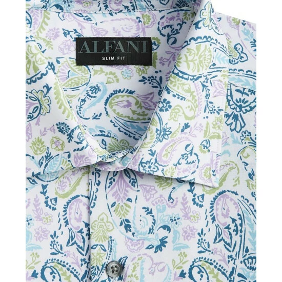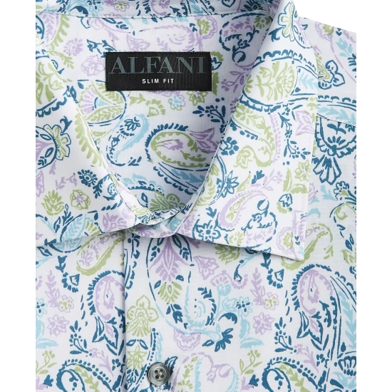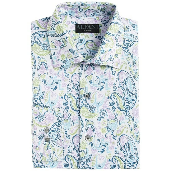 Outfitted with moisture-wicking stretch fabric and a classic paisley pattern, Alfani’s slim-fit dress shirt brings versatility and comfort-forward style to your growing formal collection.