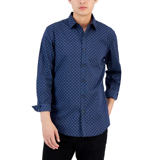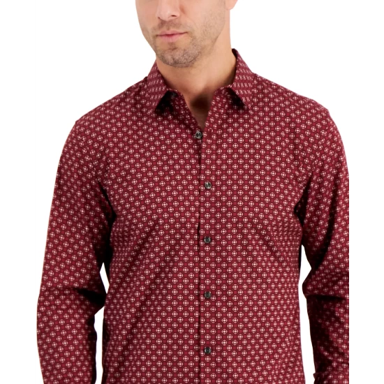 Alfani finishes off your office style with the contemporary fit of this button-down shirt, showcasing allover medallion print.