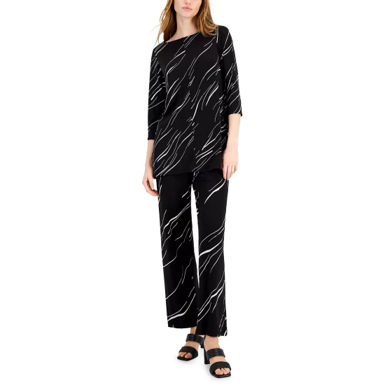 - Bottom: hits at ankle; piping trim; drawstring at elastic waist