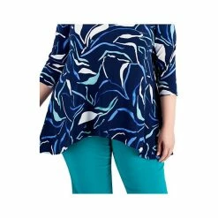 Alfani’s stylish plus size swing-silhouette tunic combines an asymmetrical hem with flattering 3/4-length sleeves.