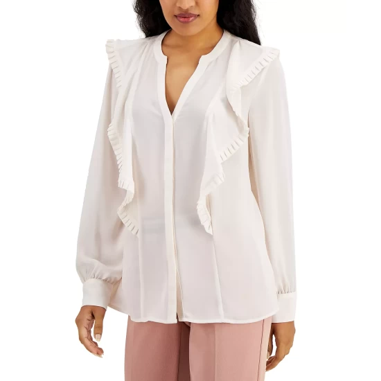 Bring fresh energy to your collection with this Alfani top, an intriguing look with a dynamic print and soft ruffles.