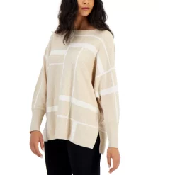 A bold geometric print enhances the fluid drape of Alfani’s dolman-sleeve boatneck sweater.